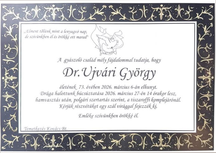 TISZTELETTEL EMLÉKEZÜNK SZERETETT MUNKATÁRSUNKRA, PORTÁSUNKRA, DR. UJVÁRI GYÖRGYREEgyéb / 2026-03-11 2026-03-27